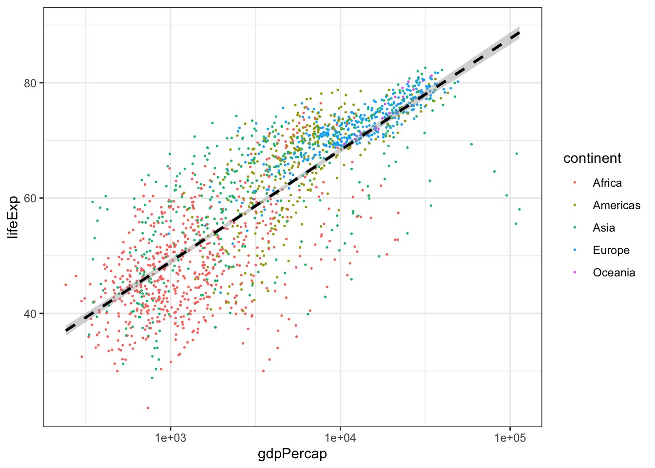ggplot(gapminder, aes(x = gdpPercap, y = lifeExp)) +
