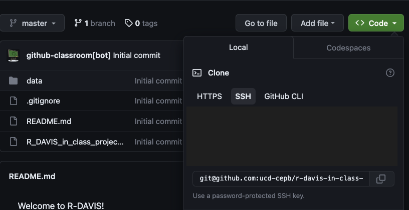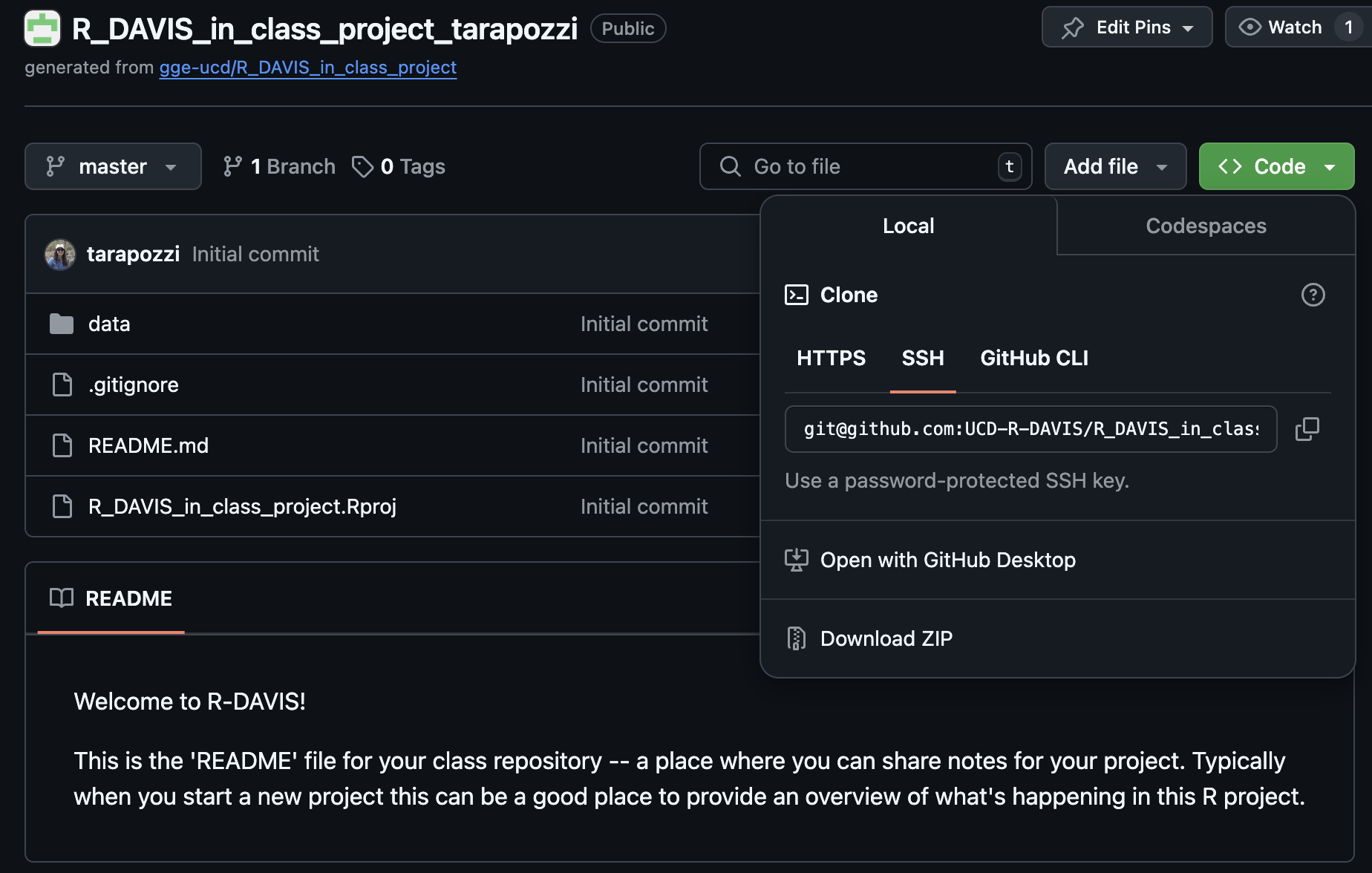 SSH” linkgit@github.com:UCD-R-DAVIS/R_DAVIS_in_class_project_YourGithubUsername.git